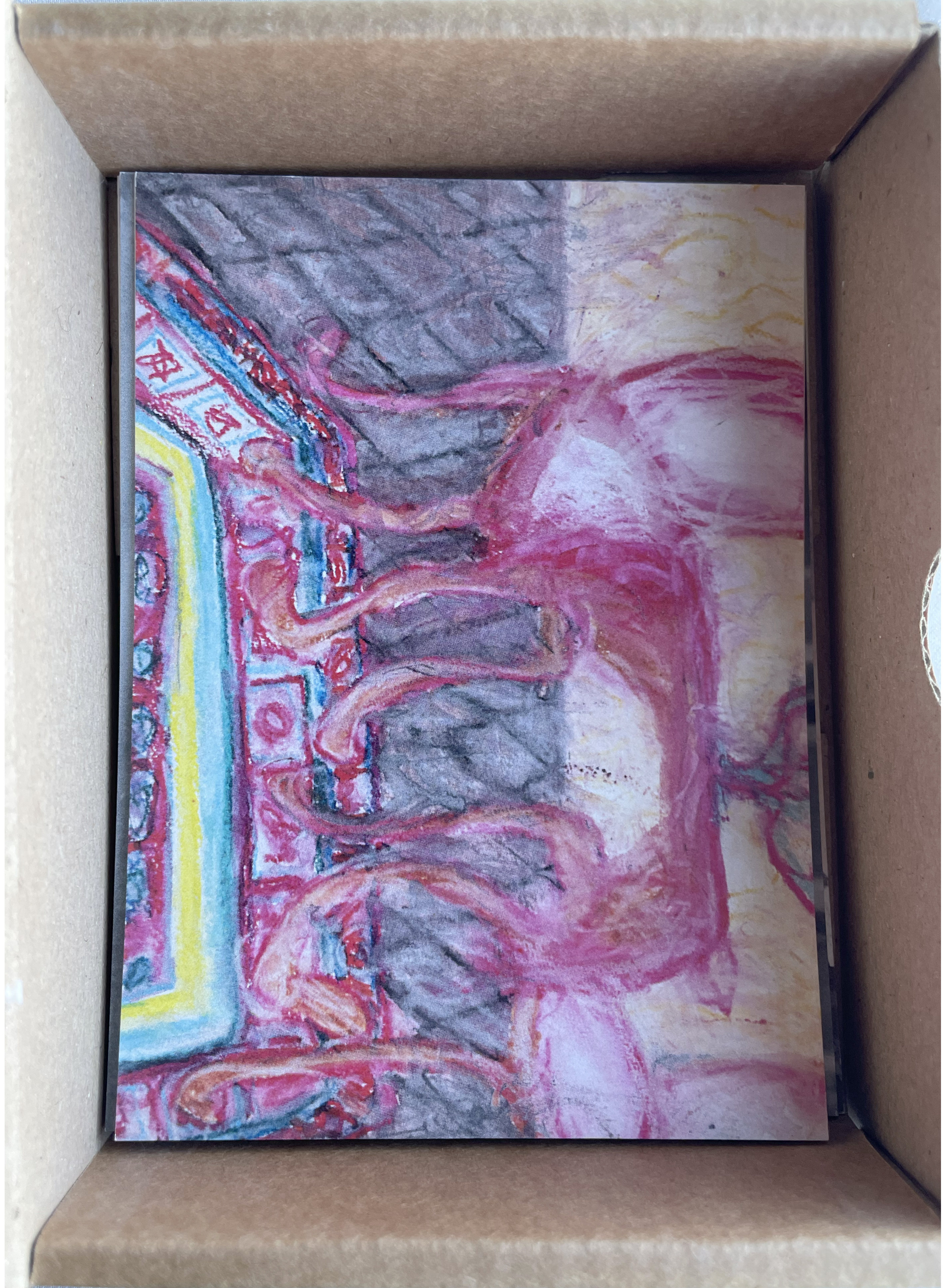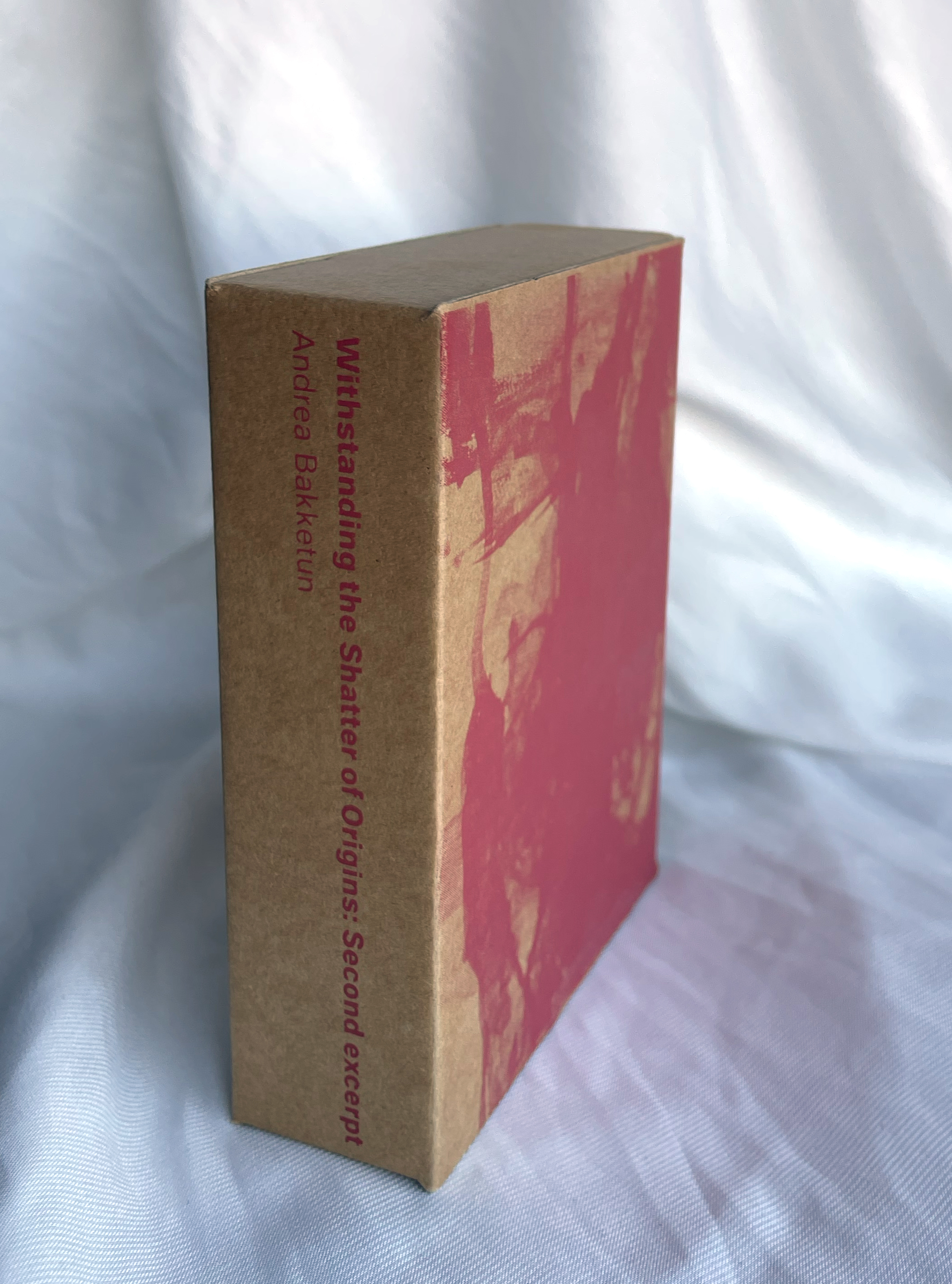 Withstanding the Shatter of Origins is a limited edition artist book series. The books are nonlinear project diaries consisting of a number of loose pages depicting scanned water colors, fictional texts, descriptions of working processes and photos. The pages are contained in a Michael Harding oil paint box (125 x 85 mm) with silk screen print.
